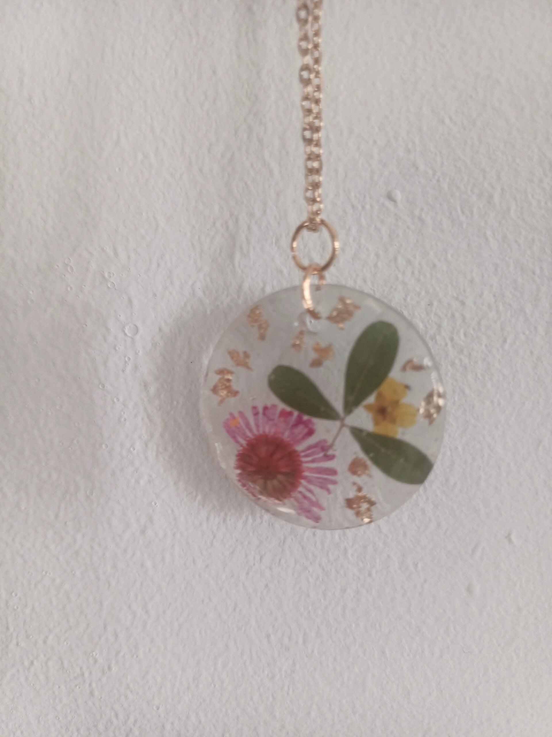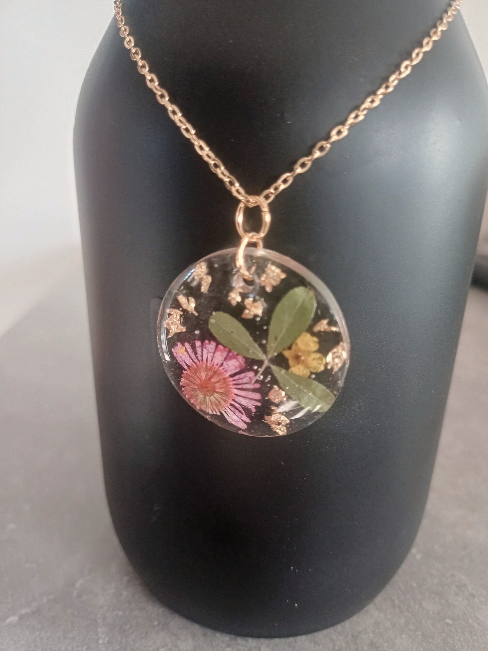 Collier doré en acier inoxydable 46 cm avec son médaillon transparent et fleurs séchées intégré