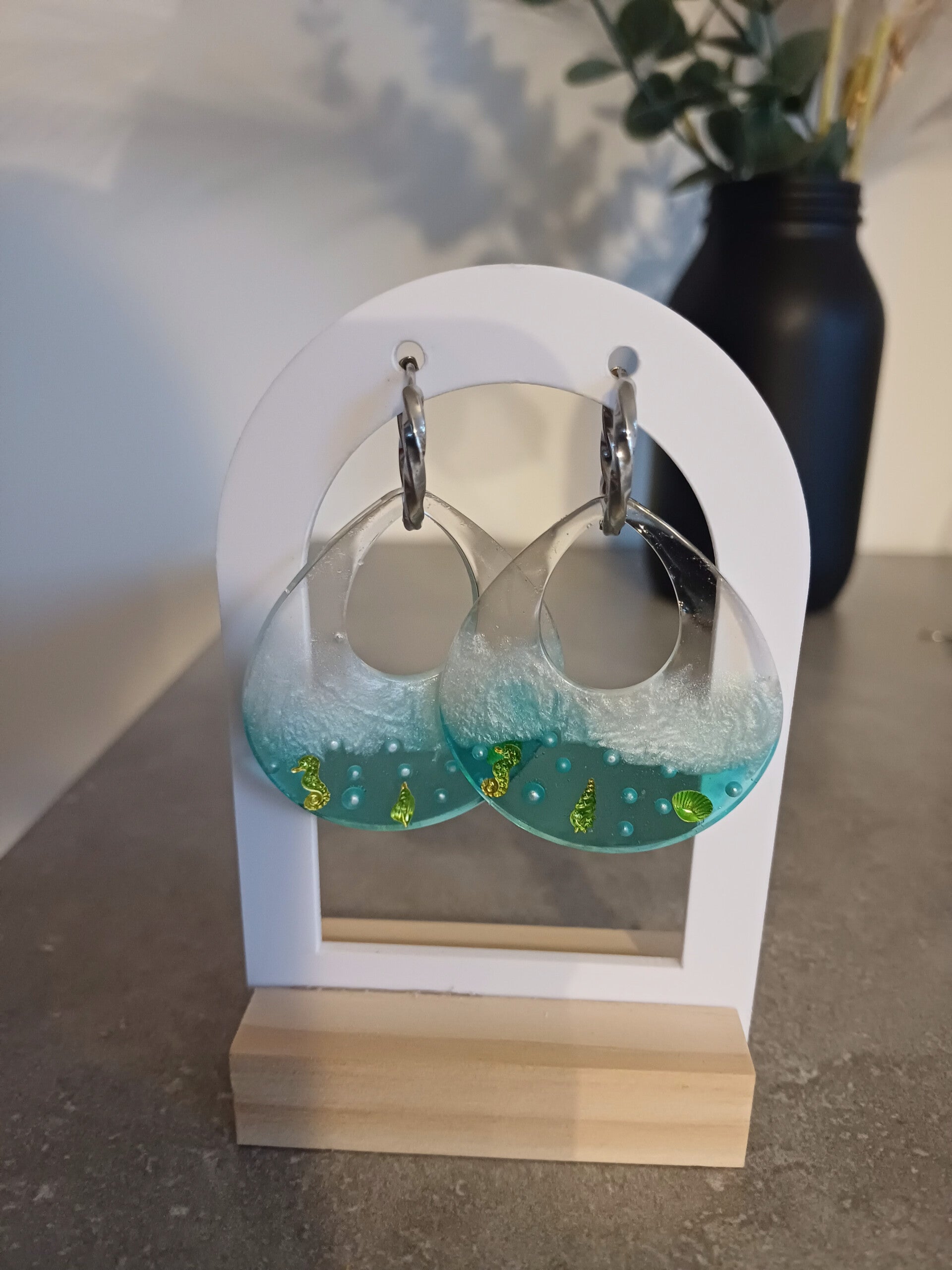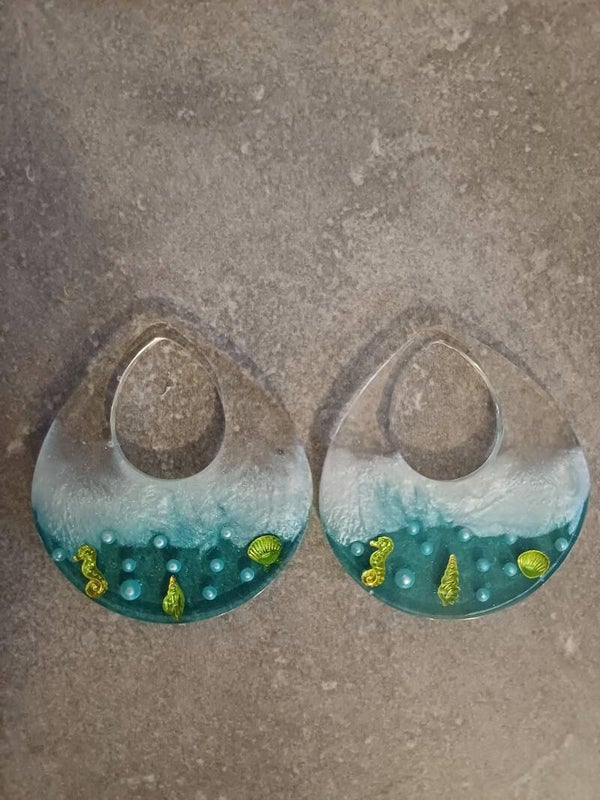 Grandes pampilles en formes de gouttes d'eau bleues, blanches et transparentes. Coquillages et perles intégrés